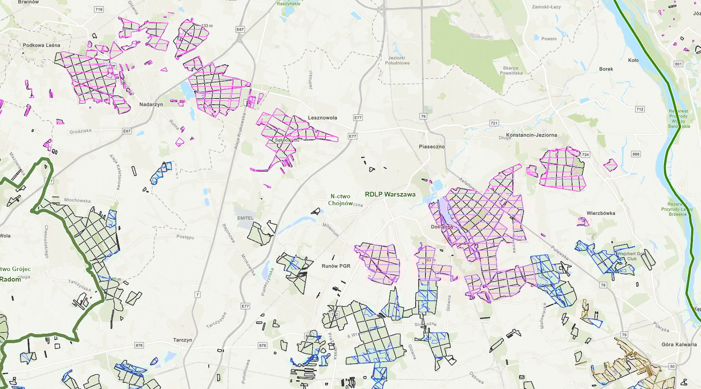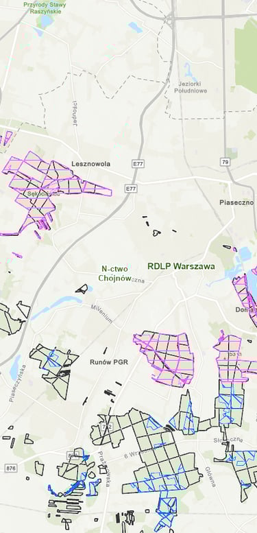 Mapa ukazująca zasięg obszarów "ochrona miast", kolor różowy, oraz "ochrona wód", kolor niebieski - na obszarze Nadleśnictwa Chojnów
